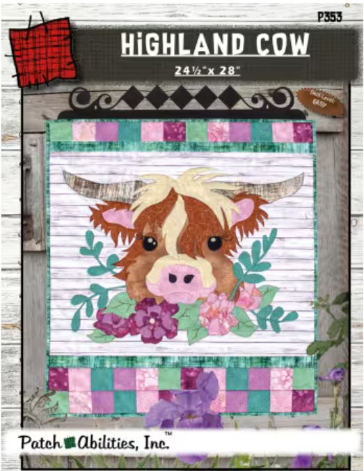 Highland Cow surrounded by her pasture flowers offers a beginner friendly combination of applique and piecing. She's easier to make than she appears, easy using traditional raw edge applique with fusible web. This item is the pattern only. The 22" Diamond Swirls hanger is also available - see suggested items.