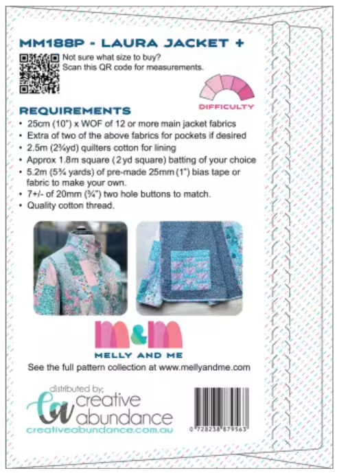 Introducing The Laura Jacket - Now in Plus sizes! A striking ladies' patchwork jacket pattern crafted with your unique style in mind. Make a statement with this quilted jacket using your favourite fabric collection or that cherished scrap stash. Do you have a quilt lying around that is rarely used? This pattern also gives instructions to whip up the jacket quickly with a beautiful pre-made quilt. Customise your jacket for mid-season or winter warmth by choosing your preferred batting. Opt for a soft, thin Bamboo batting as I did for that perfect mid-season jacket with drape, or switch to wool for ultimate warmth on the coldest days. This printed sewing pattern contains fully illustrated step-by-step instructions and full-sized templates to create your own Laura Jacket. This sewing pattern is recommended for intermediate sewers.