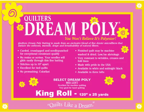 - Dream Poly resists bunching and shifting and is strong enough to stitch up to 12″ apart giving the quilter incredible freedom of design.