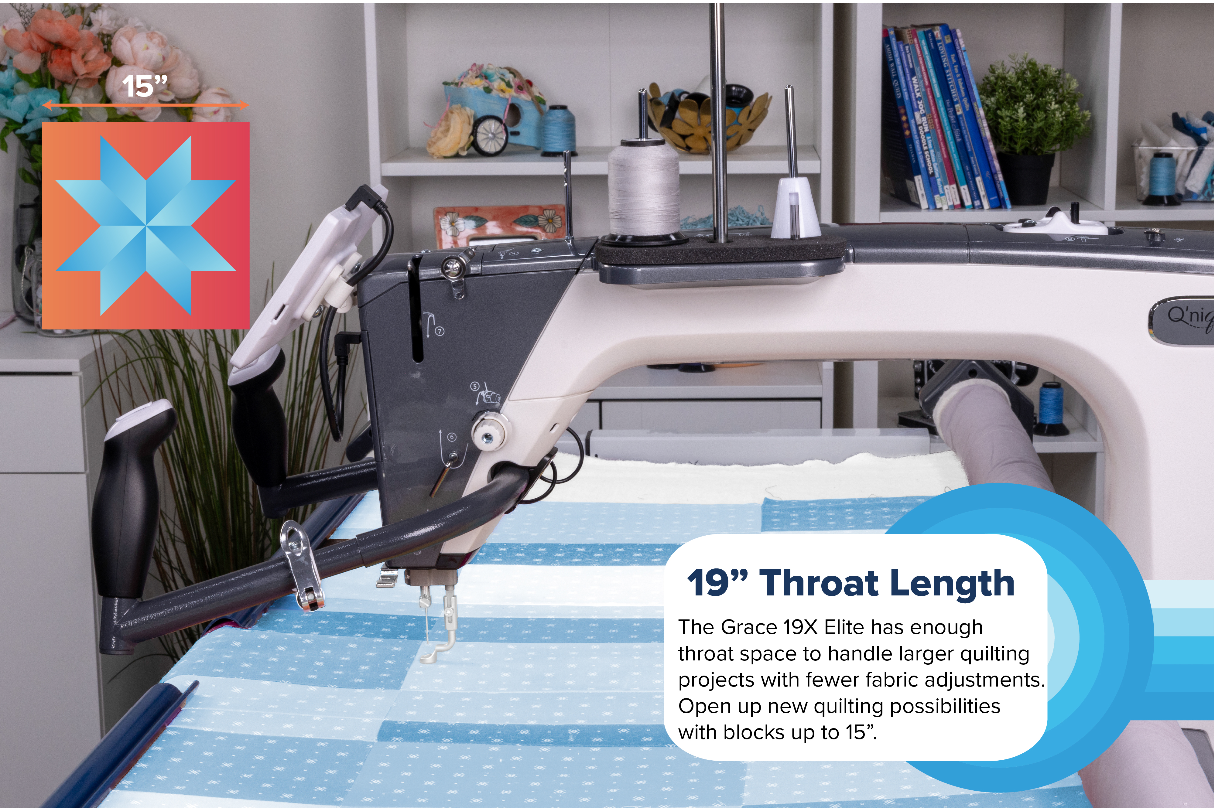 From the moment I opened the box I was amazed at the thought that went into this product from the Grace Company. The parts were labeled and separated in boxes with titled for the Step by Step process of setting up the machine. The tutorial on Etchetogether.com was so awesome and took me step by step through the process, making it so easy to complete by myself. After an hour or so of practicing on a practice panel, I put my first small project on the machine and the stitching was perfect. I had never stippled anything with such ease. I absolutely love my Q'nique 19X Elite and so thankful that I finally treated myself to such an awesome product.