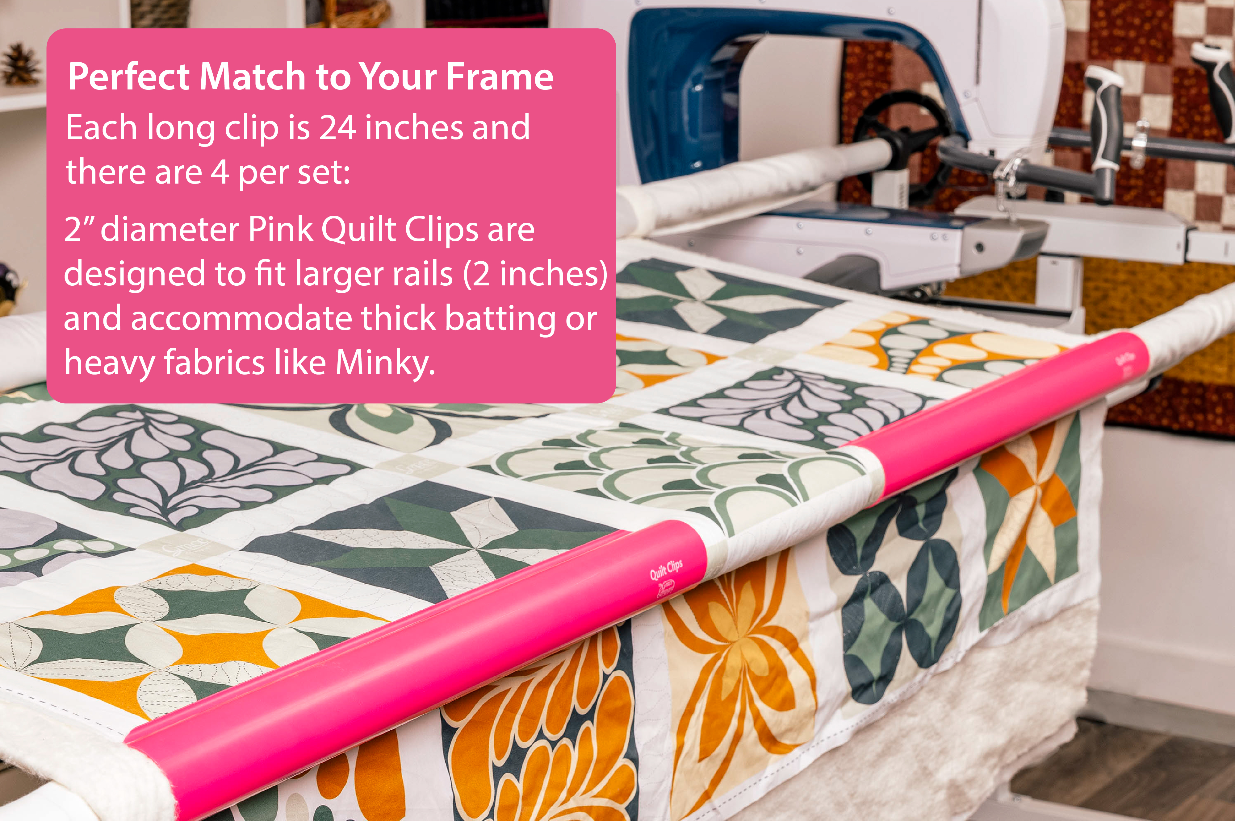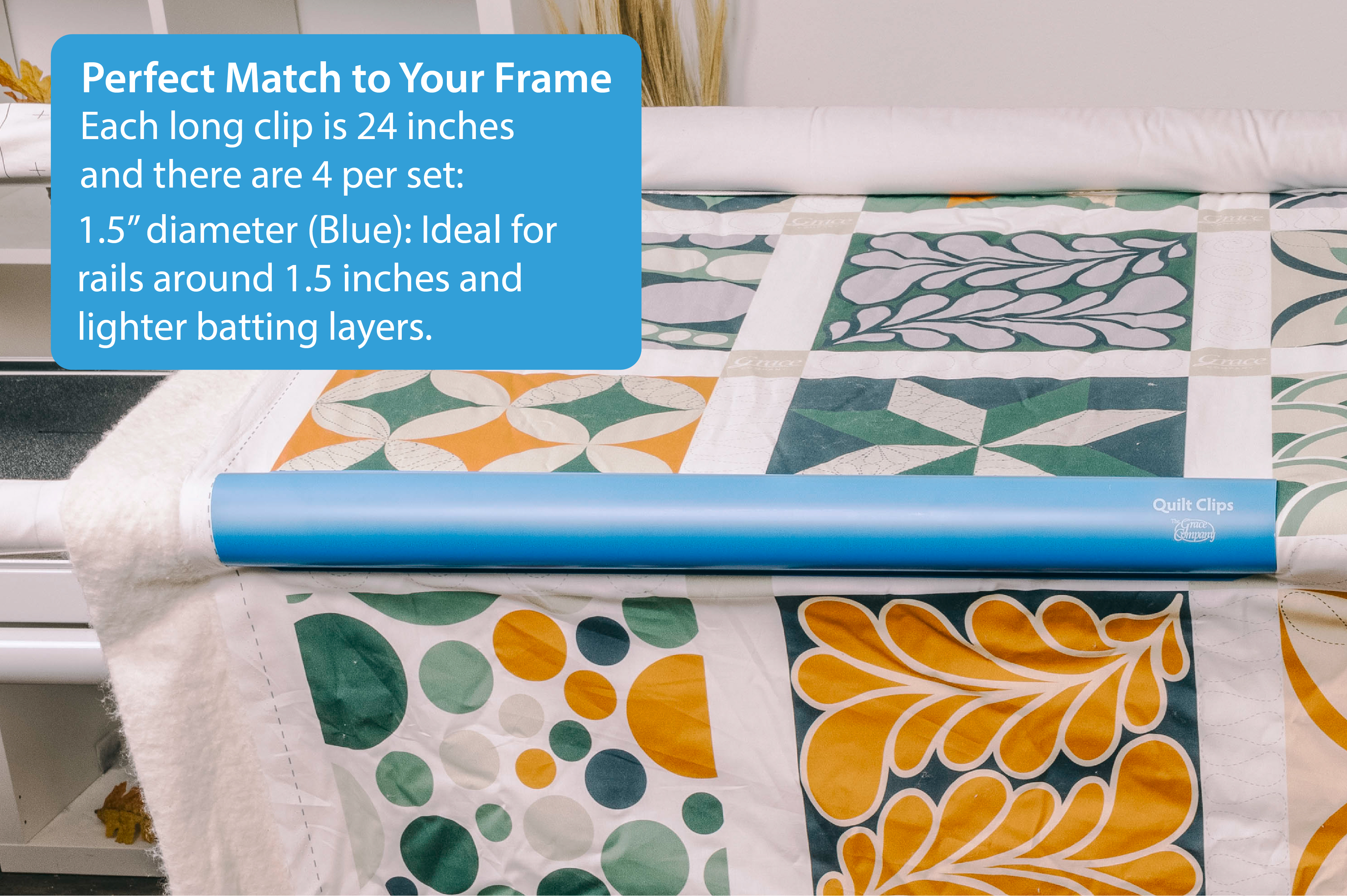 Quilt Clips are purchased in either 1½ inch or 2 inch diameters, so you can get the set that will best fit your frame. See a frame rail-diameter list below to see which size you should get.