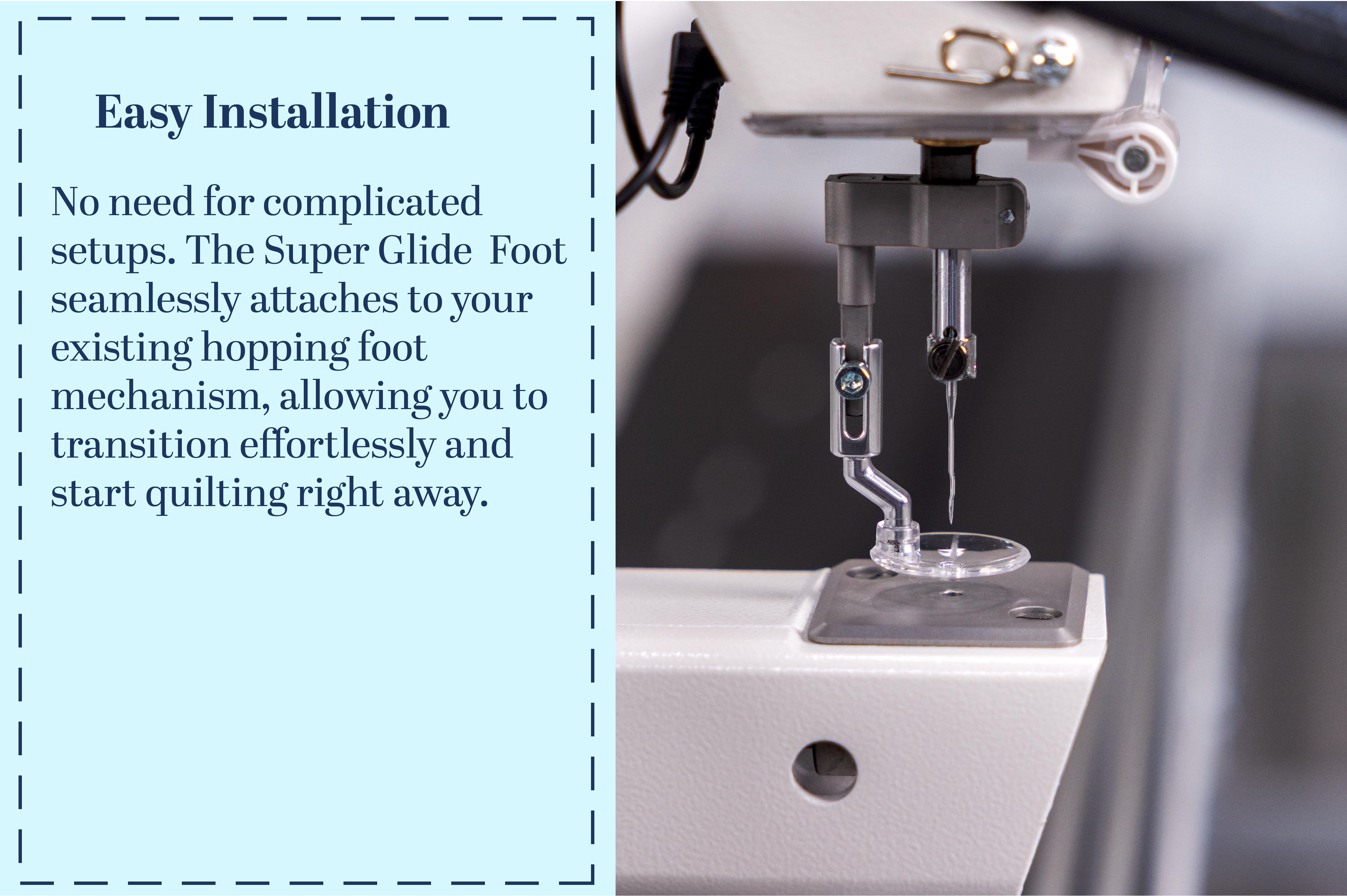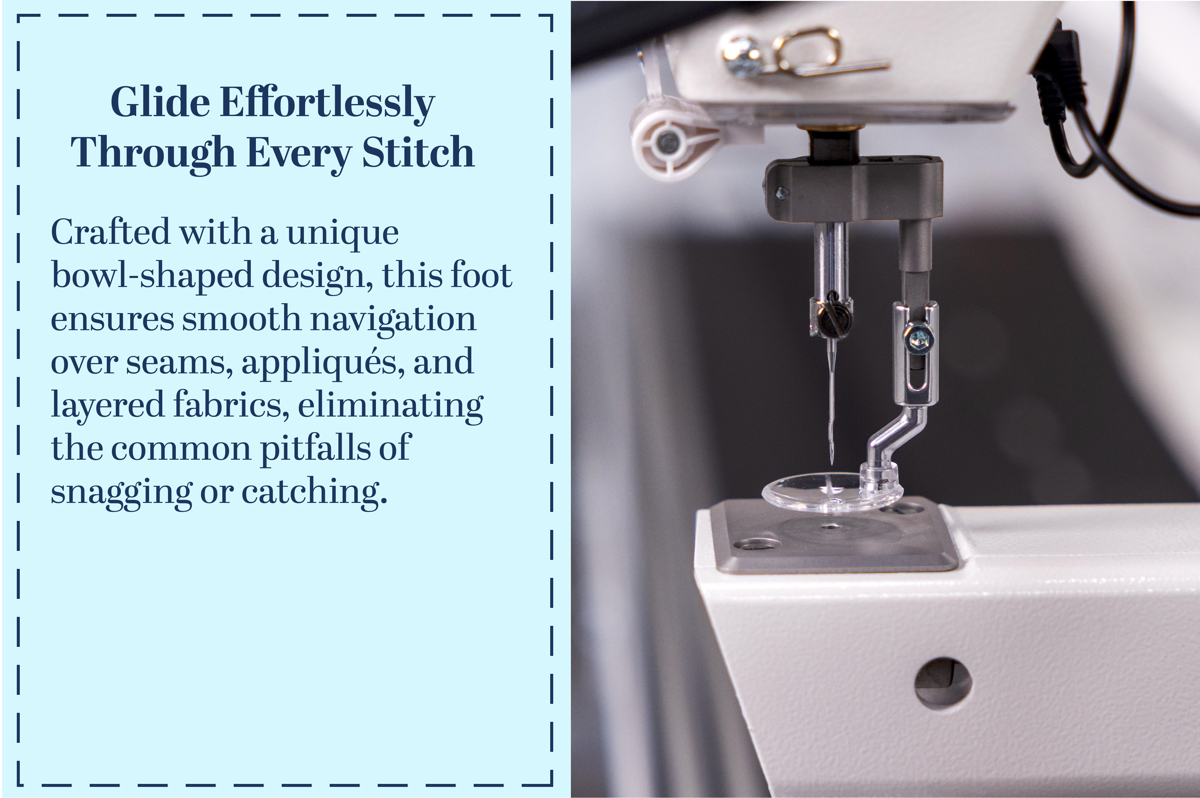 Experience smooth, snag-free quilting with our new and improved  Free Motion Quilting Foot. Specially engineered to glide effortlessly over seams and stitches, this unique foot ensures consistent, uninterrupted motion—no matter how intricate your design. Glide effortlessly as you free motion quilt.